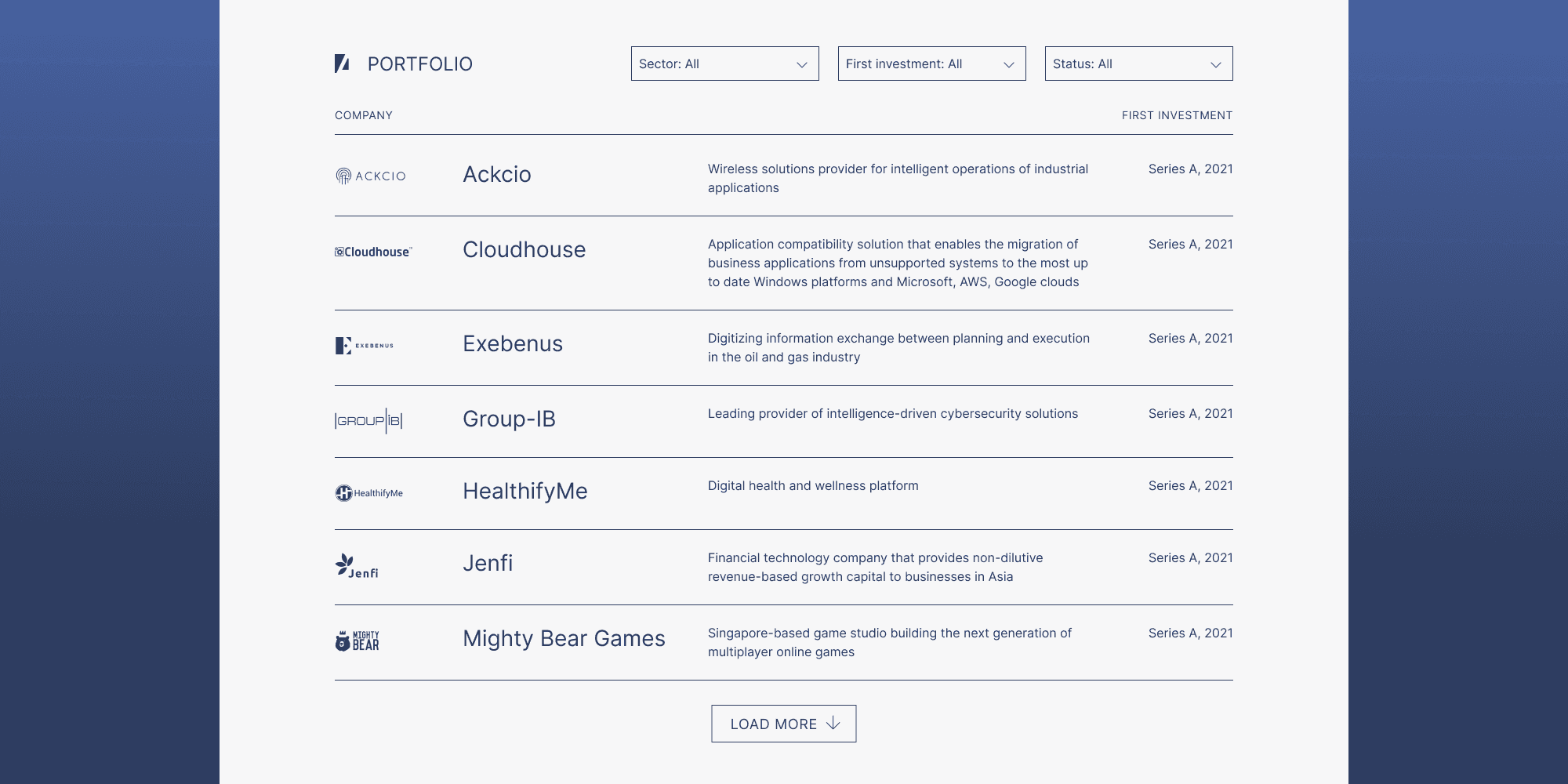 We displayed the portfolio as a table with filtering to help potential startups find examples that interest them.