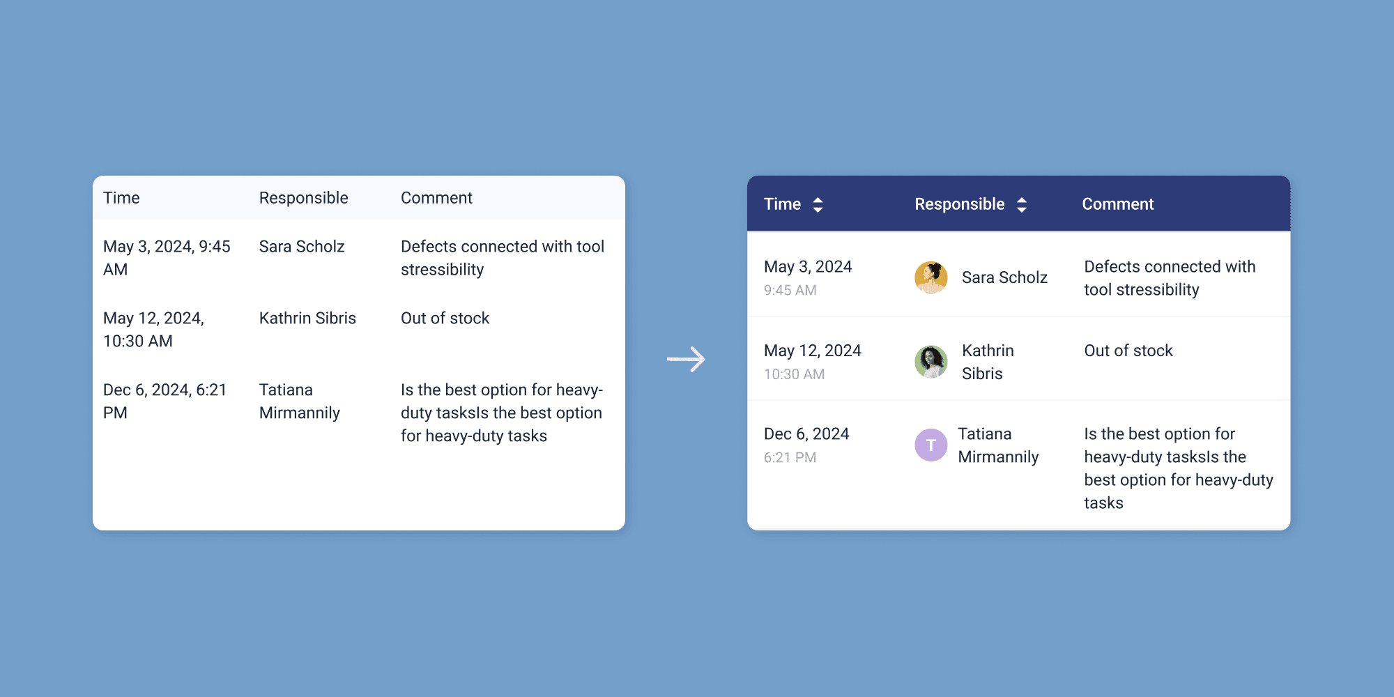 Visualised with avatars of employees for faster scanning. Dates divided from time help perceive information gradually. Added sorting helps to find the needed things faster.
