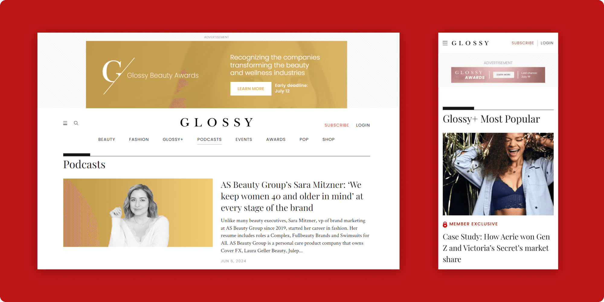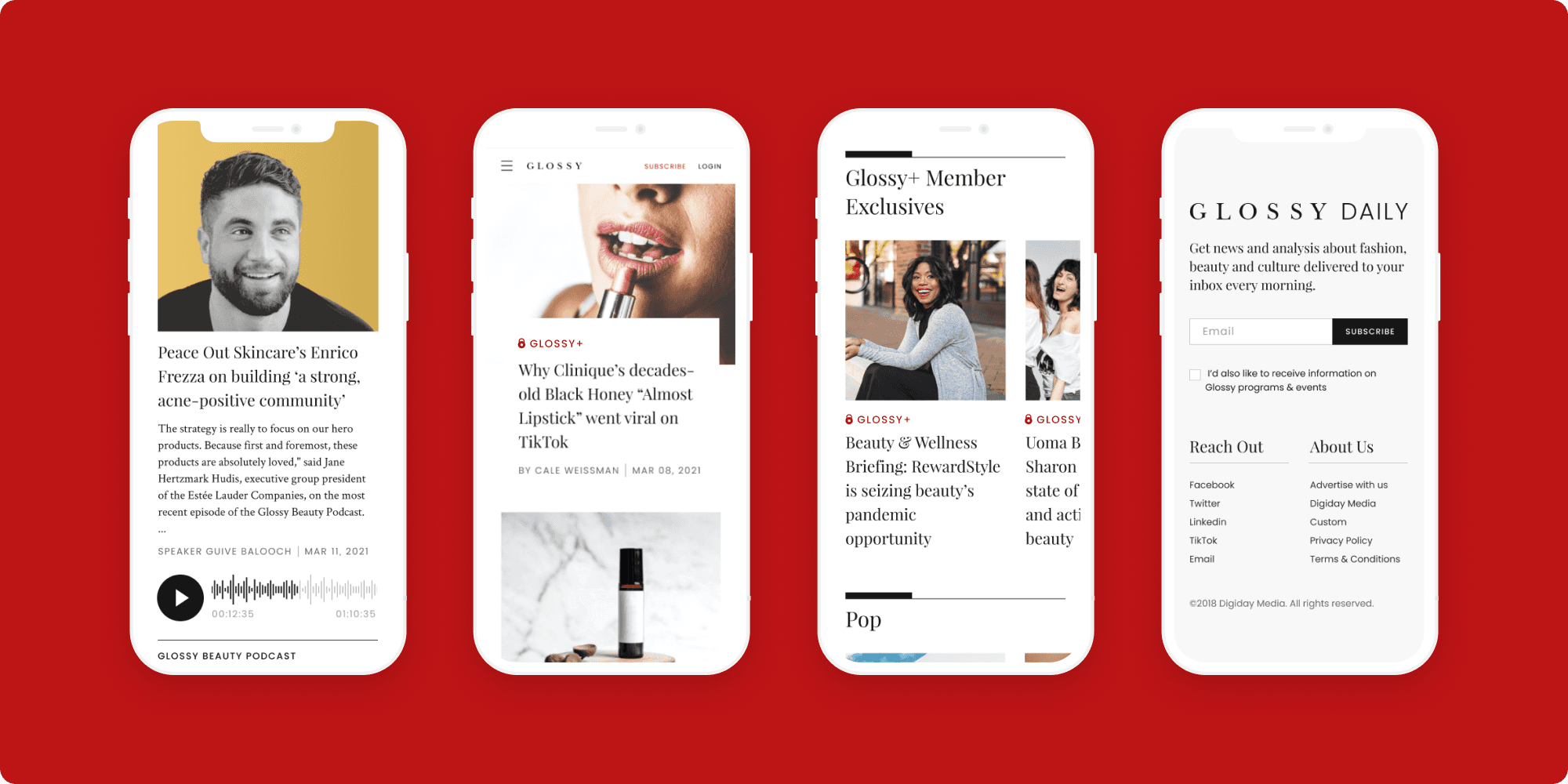News and trend analytics in the fashion industry. Articles, podcasts, videos, and more. I was hired to help Glossy attract more subscribers via improved user experience.